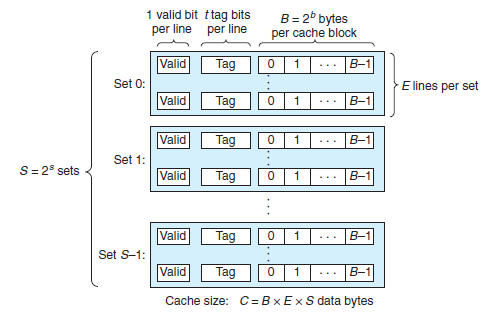 캐시 메모리 총 사이즈 = S x E x B 바이트 (B = 메인 메모리의 각 블록 byte 용량)